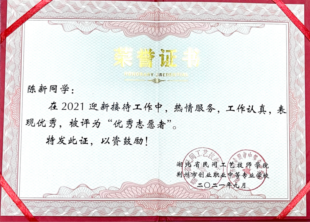 2021年9 月在学校组织的专业教学实习中!荣获优秀实习生等荣誉称号。在校还曾多次获得“优秀学生会干部”“优秀团员”“优秀志愿者”等称号 。
