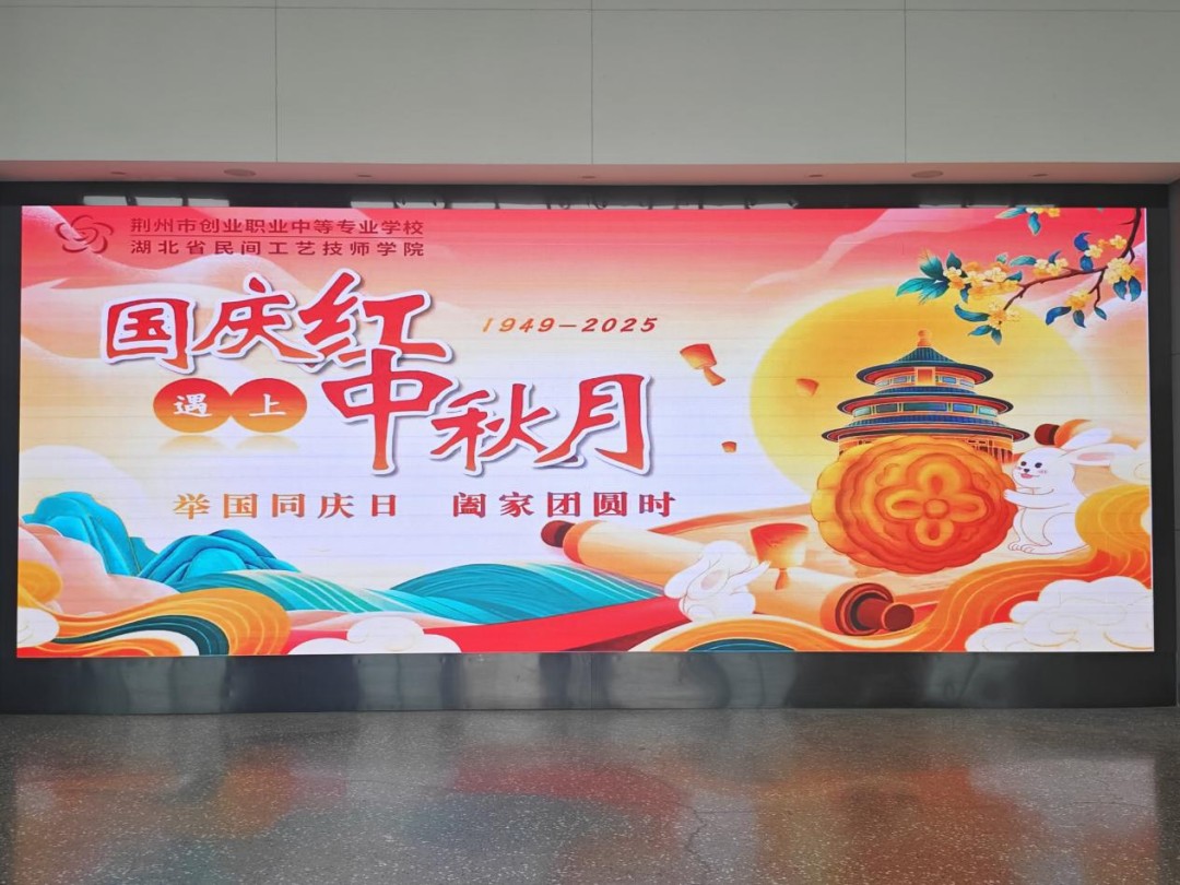 校门口,簇新的红灯笼高悬,光影流转间传递着对祖国的深情祝福。主干道上,学生志愿者细心更换下旧国旗,崭新的五星红旗迎风舒展,汇成庄严肃穆的“红色长廊”,与绿树蓝天辉映。教学楼、公寓楼的电子大屏,循环播放着融合天安门、长城与校园元素的祝福海报,“祝福祖国繁荣昌盛”的标语点亮日常。